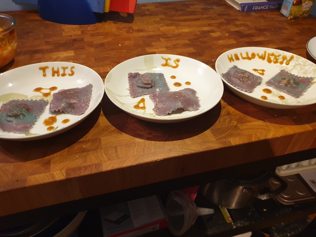 Finally, a pudding—yes, a sweet pasta. Cinnamon pasta, to be specific, coloured with food dye (unlike the natural colourings of the spinach and pumpkin pastas). It wasn’t quite as I envisioned colour-wise, but you know what, it looked more like a Halloween-Christmas present anyway. Isn’t that the way Jack would want it? Or certainly what the residents of Halloween Town would prefer?