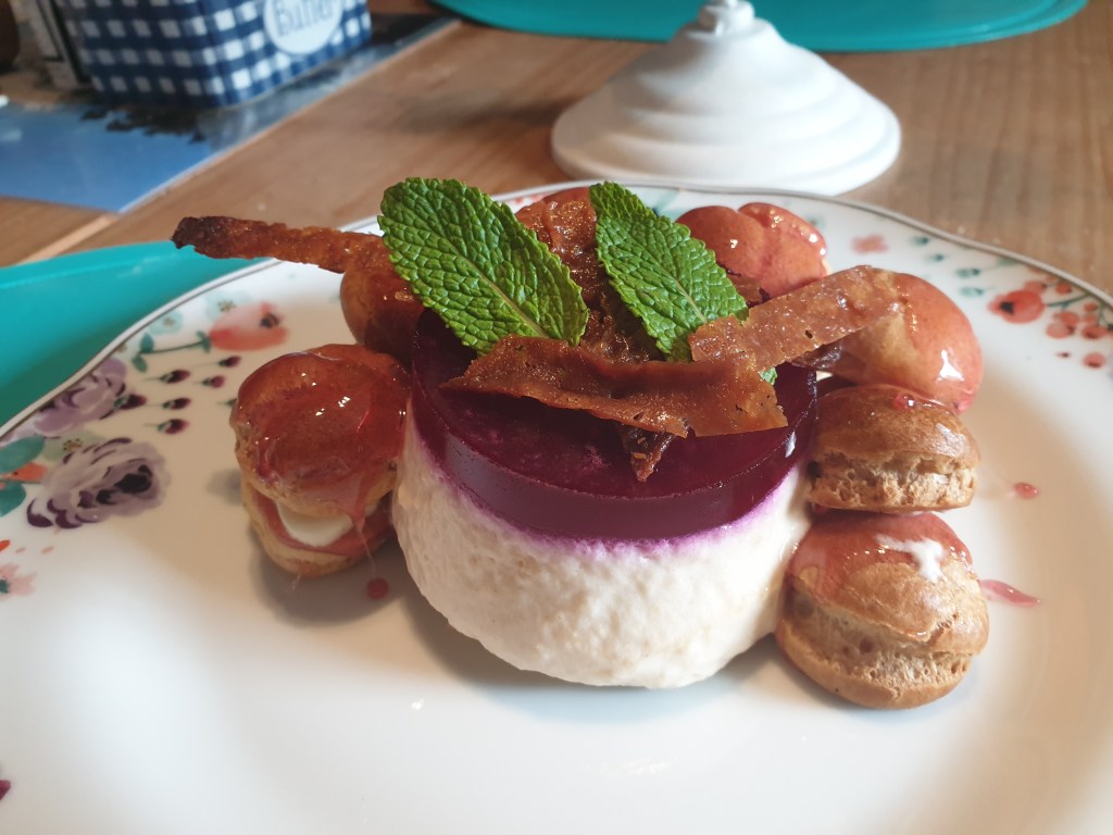 And so I bring you—my ‘Anne of Green Gables Scope-For-The-Imagination Raspberry Tart’. An apricot mousse, sitting on an almond base, topped with a lusciously smooth raspberry jelly, surrounded by Anne’s preferred ‘puff sleeves’ (choux buns filled with an almond crème diplomat for that fragrant frangipane flavour), and topped with a crown of twigs and leaves befitting of the regality of Princess Cordelia (brandy snaps, made with Breton honey and mint leaves).