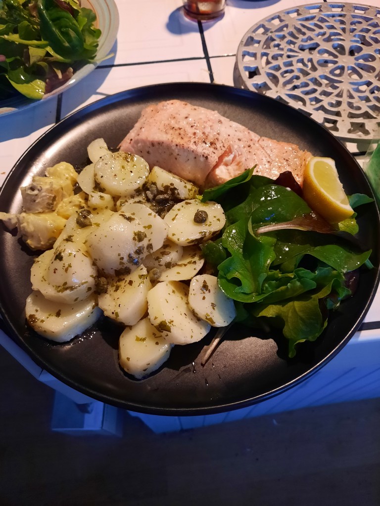 - I don’t like potato skin or potato salad, but for anybody who does it was a fairly simple process. There may-be slightly too much mayonnaise for some people (like my mother) but on your second time cooking this dish, it’s easily adjusted. My only suggestion would be to put some fresh herbs and perhaps some caper juices to loosen the mayonnaise before putting on the potatoes. It was just missing a bit of freshness, but otherwise it was very well seasoned with a nice texture.