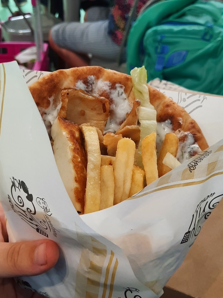 - A Gyro from a truck in the inside Hall filled with Halloumi, Chicken, Salad, Chips/Fries, Tzatziki and a lovely, fluffy flatbread on the outside. We split this one and again I would definitely eat another one. There were plenty of seats around both truck areas and there were other eateries around the area as well.