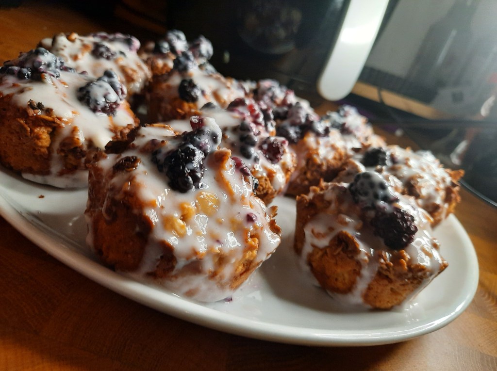 3. Cherry Cinnamon Dump Cake: Ah, yes. The ‘cake’ that splits a crowd. My Mum and I both hated this cake. My Dad loved it. The first time I saw a Dump Cake recipe was on B. Dylan Hollis’ YouTube Channel—where he expressed what I felt whilst making it myself—if I’m making a cake, why don’t I just make a cake? The dump cake’s entire existence is to make a cake in as lazy a way as possible (his used a boxed cake mix whereas I actually had to put effort into weighing everything out in Nadiya’s version). The creation that comes out of the oven can barely claim to be a cake. What comes out is a dry, oddly crispy and doughy mix on top of uncooked, but warm, cake mix. To me it was just an unpleasant eat and I could’ve spent the same amount of time and made an actual cake. However, based on my Dad’s reaction, I would say it probably does have it’s place for people who like it. I imagine it’s very much a Marmite of baking (love it or hate it for those outside the UK). I should also say, we used raspberries instead of cherries (not available where I live) but it wouldn’t be any better for me with the recommend cherries.