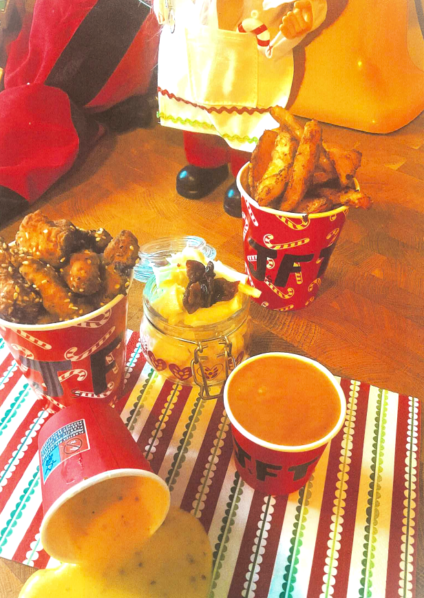 Day 8 and we’ve hit a full-on fusion meal. When I was younger my friend ‘Pepsi’ and I got into an argument. I’d recently learned that in Japan they would have KFC meals for Christmas day and she argued that it made no sense as surely the Japanese don’t celebrate Christmas? However, despite the argument, the KFC for a Japanese Christmas stuck with me and I’ve since looked into their Christmas meals in more depth (still can’t answer my friend’s question though, I’ll admit). So when I was planning some Christmas themed recipes I really wanted to create a KFC meal– with Japanese inspiration (but using ingredients I could actually get). Thus my JFC (Japanese Fried Chicken) recipe was born. Is it exactly what the Japanese eat when they buy their KFC meals for Christmas? No. Is it a tasty treat and one of my Mum’s favourite meals we cooked? You better believe it. For an extra crispy chip/fry, after roasting them in the oven, give them a quick deep fry in oil at 190 degrees C. In my opinion, it’s the perfect chip/fry (hopefully in the New Year I’ll be putting this to the test so stay tuned).