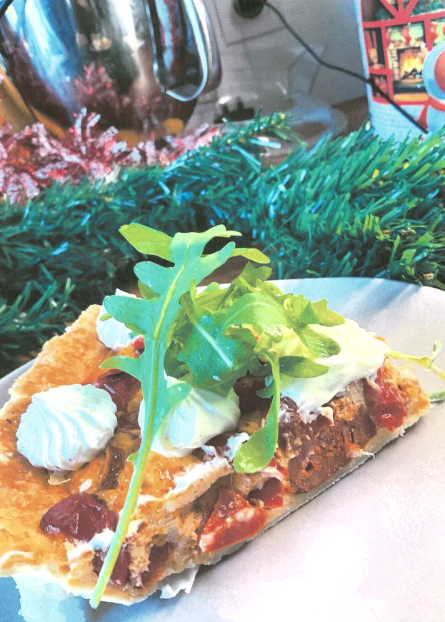 Day 19 and we have an older creation of mine. The first Christmas dinner I cooked for my family was as a young-ish teenager. My sister and I decided, one year, that we wanted to make Christmas dinner for the entire family (Mum, Dad, Grandma and Grandad, our Uncle and ourselves, of course). We did a lot of planning, a lot of prep and we made every meal that day– including breakfast (yes, we made menus for people to pick their own. We went all out), mains, canapes and desserts. One of our favourite parts of the meal was one of the canapes– a piece of fried chorizo, fried red pepper slice, goats cheese and rocket on a toothpick. It’s a combination made in heaven and became a mainstay for a while in all our celebration meals. Years later I decided to incorporate those same flavours into a Quiche and thus ‘Our Family’s Christmas Quiche’ was born. It’s pretty simple to make, looks fancy with the addition of the Goats Cheese cream and is a true celebration lunch or buffet addition. All the people who’ve had it have nothing but good things to say… and I think it deserves it. It’s one of my earliest creations and one of my favourites that I turn to again and again.