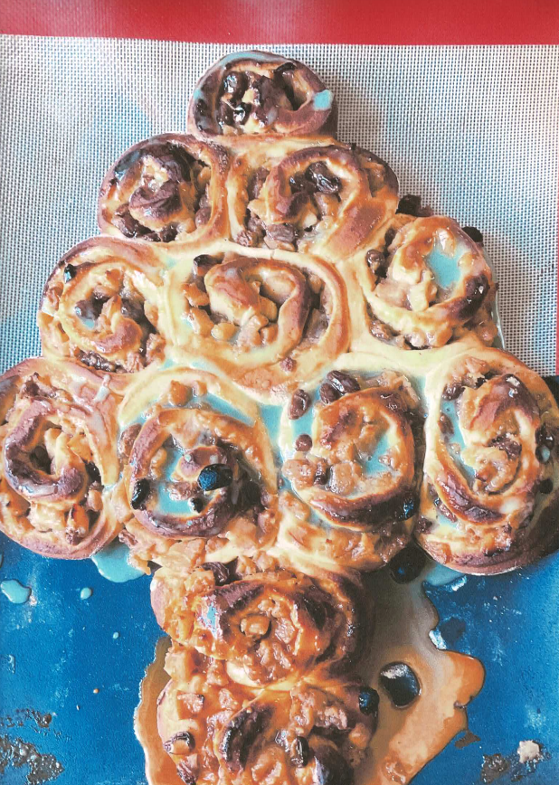 Day 21 and we’ve reached a more involved Christmas Day Buffet type of festive cookery. This bread came, very simply, from the thought– what if, tear and share loaf but Christmas Tree shaped? It then developed into a spiced fruit bread crossed with a cinnamon roll situation– but as a tear and share Christmas Tree. It is incredibly rich and you certainly wouldn’t be able to eat much but the bit you had, would taste great. And, as a great bonus, it’s a real showstopper on a Christmas Buffet table.