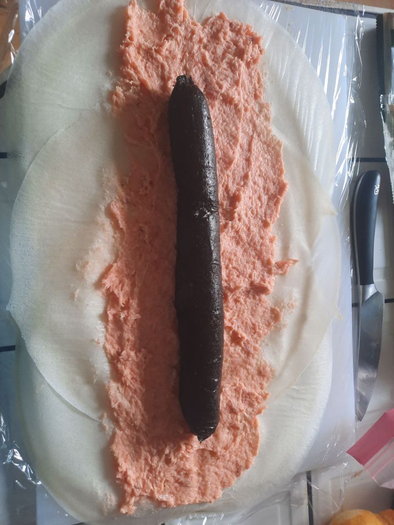 I decided on going back to another older concept I used years ago back when I entered a Cookery Competition in my county. I decided to make a ‘steamed fish sausage’. I used to make this quite a bit at College with salmon cream wrapped in leeks. For the competition I used a more local fish: smoked herring. For this dish I decided on using mackerel for one smoked sausage, wrapping it in sushi nori sheets to represent the seaweed frequently mentioned in my research. I added some coriander and lemon juice (as well as the cream and cream cheese to get the right texture) to really boost the flavour, something I again saw frequently mentioned as imported ingredients to colder climates (mainly the lemon, I just liked the flavour of the coriander more than other herbs with this dish). I made another layer of the sausage using salmon, to represent Norway, Sweden etc.’s frequent use of salmon (it’s also easy to buy where I live so a good bulking agent for the sausage to add a real depth of fishy flavour). The whole sausage was then wrapped in brick pastry and baked (I never found Brick Pastry in the UK but it’s seemingly everywhere in France. If you make this dish and can’t find Brick, use Filo Pastry but use more layers of it stuck together with melted butter for the best results).